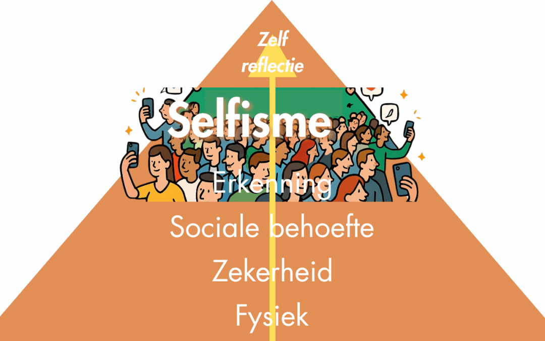 En terwijl ik die krom geformuleerde vraag las, dwaalden mijn gedachten af. Naar die piramide van Maslow en hoe wij daar tegenwoordig in staan. Ergens op weg naar de top zijn we als samenleving een beetje verdwaald. We zijn blijven steken op niveau vier: de behoefte aan waardering. Een volkomen begrijpelijke behoefte — iedereen wil erkenning, respect, het gevoel iets bij te dragen. Maar in onze tijd is die behoefte uit zijn voegen gebarsten. We willen geen waardering meer, we willen permanente bevestiging. Liefst met een like, een sticker of een applaus-emoji. En zo is er een soort tussenlaag ontstaan in de piramide. Geen officiële trede, maar wél eentje waar het druk is. Ik noem het: niveau 4+ ofwel Selfisme.